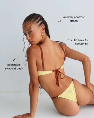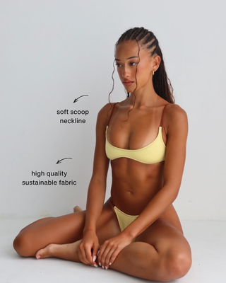 our scoop bikini top has thin adjustable straps and a gorge plunging neckline for a minimal sporty look.